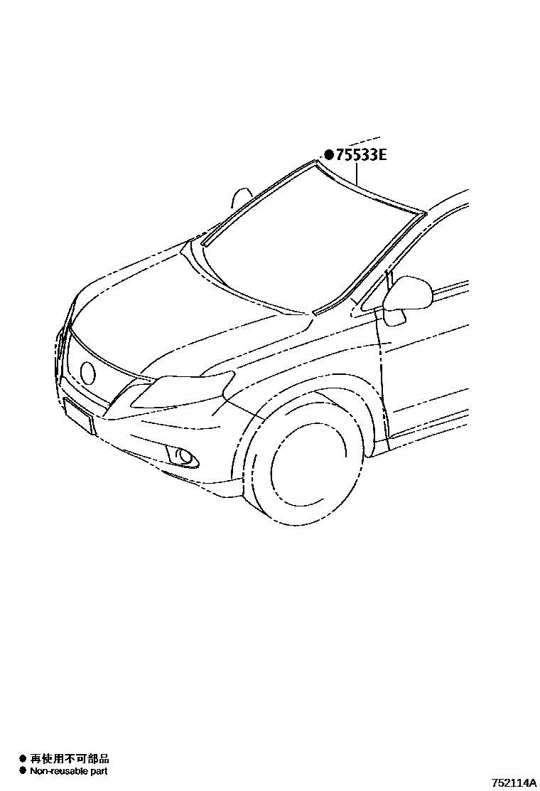 This section contains 1 genuine Toyota parts for the FRONT MOULDING system of the Toyota LEXUS RX350/450H(NAP. Key components include: MOULDING, WINDSHIELD, OUTSIDE.